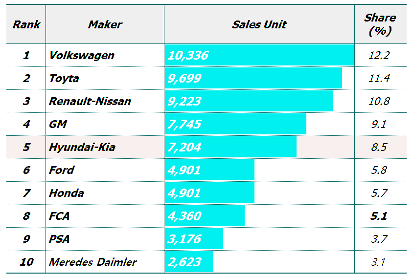 폭스바겐이 여전히 1위를 달리는 가운데 도요타, 르노 니산, GM 그리고 현대 기아차가 그 뒤를 잇고 있습니다.
