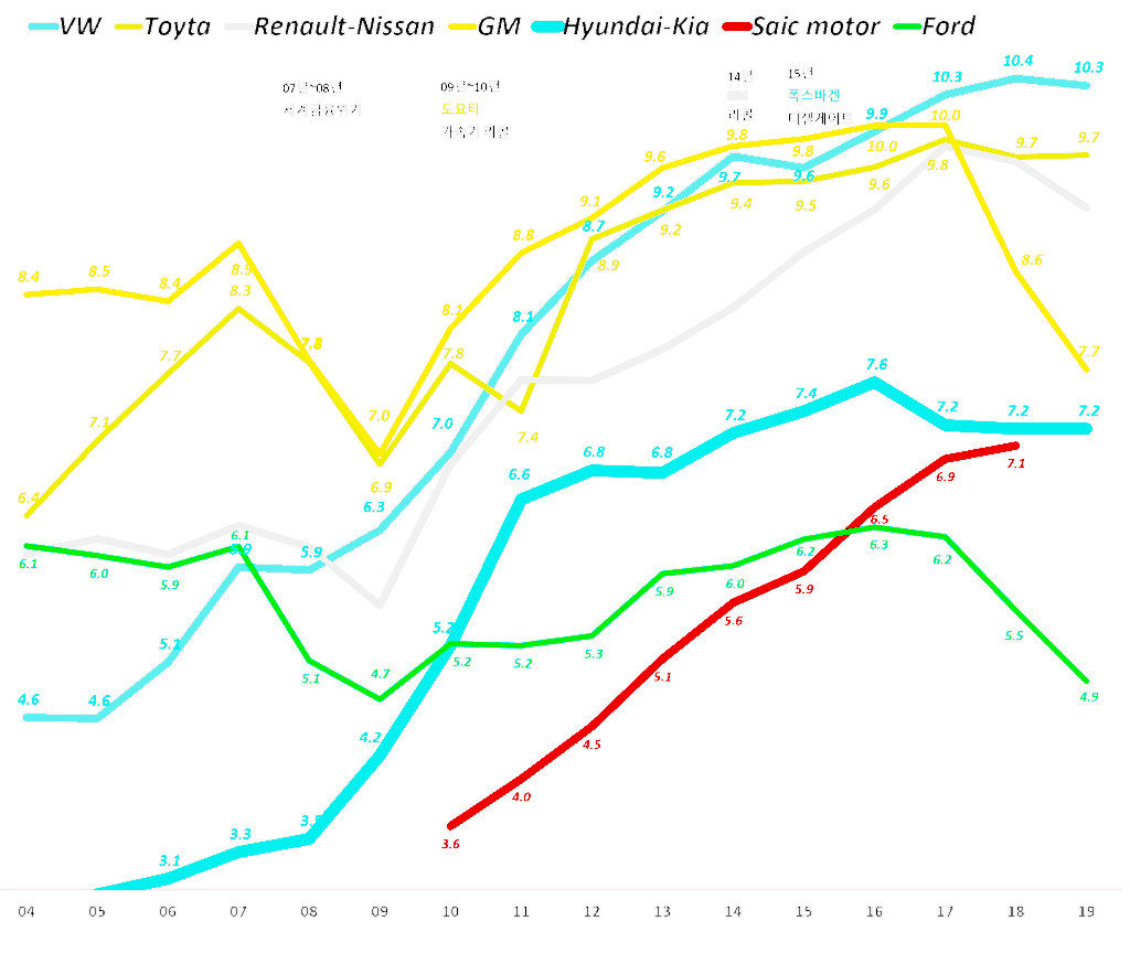 참고로 중국 Saic motor의 2019년 판매 데이타는 얻을 수 없어 비워놓았습니다.