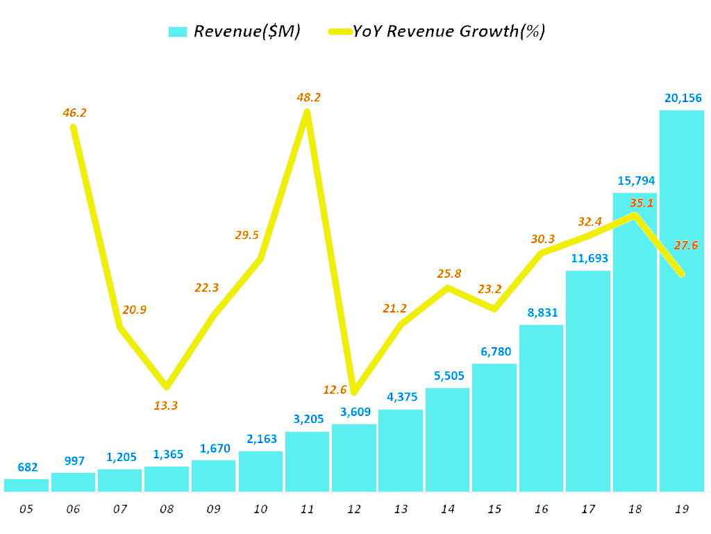 2005년 6.8억불 매출을 올렸지만 2019년에는 2020억 달러까지 매출이 증가했으니 15년 사이에 30배 매출이 늘었습니다.