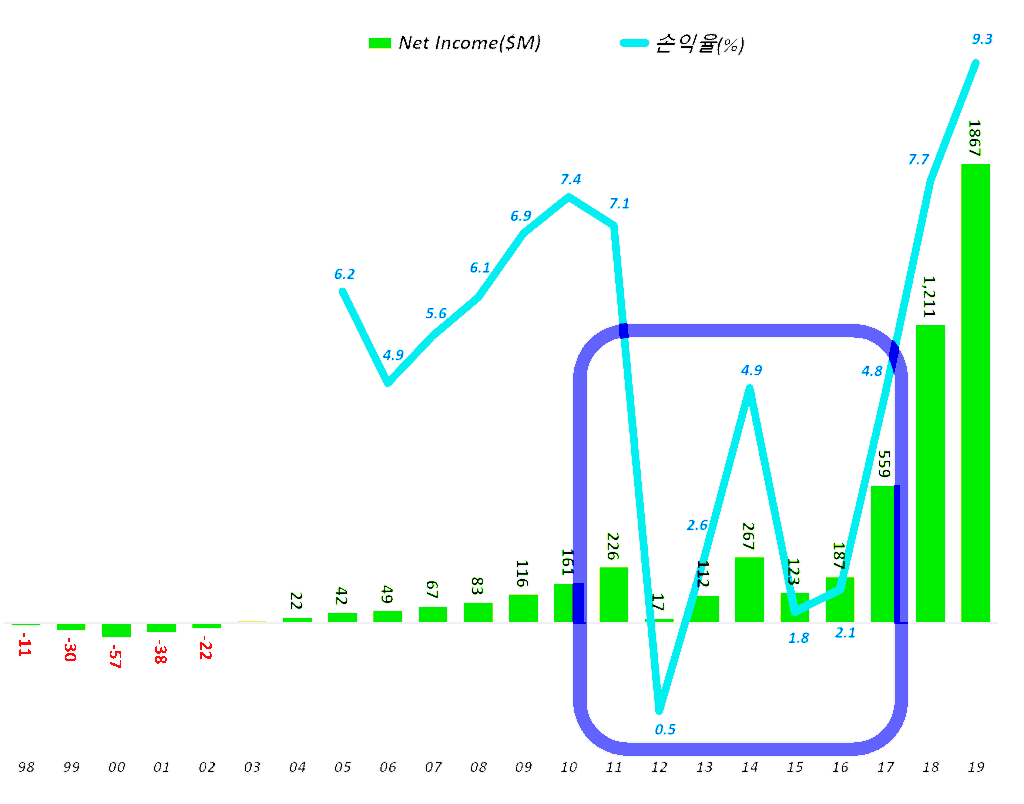 그러다보니 초창기엔 엄청난 적를 면치 못했습니다. 이러한 적자는 2002년까지 지속되다 2003년 7백만불 이익을 내면서 흑자 전환하죠.
