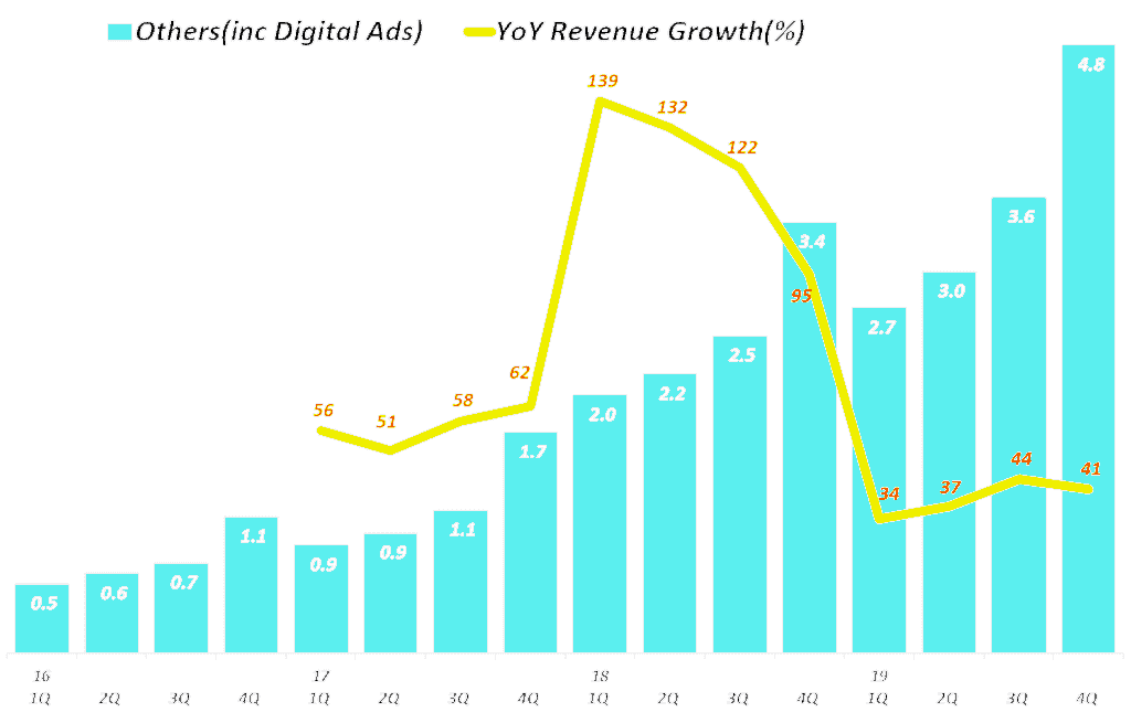 이에 따르면 광고 부문이 포함된 기타 부문 매출은 2019년 4분기 48억 달러로 전년 비 41% 성장했습니다.