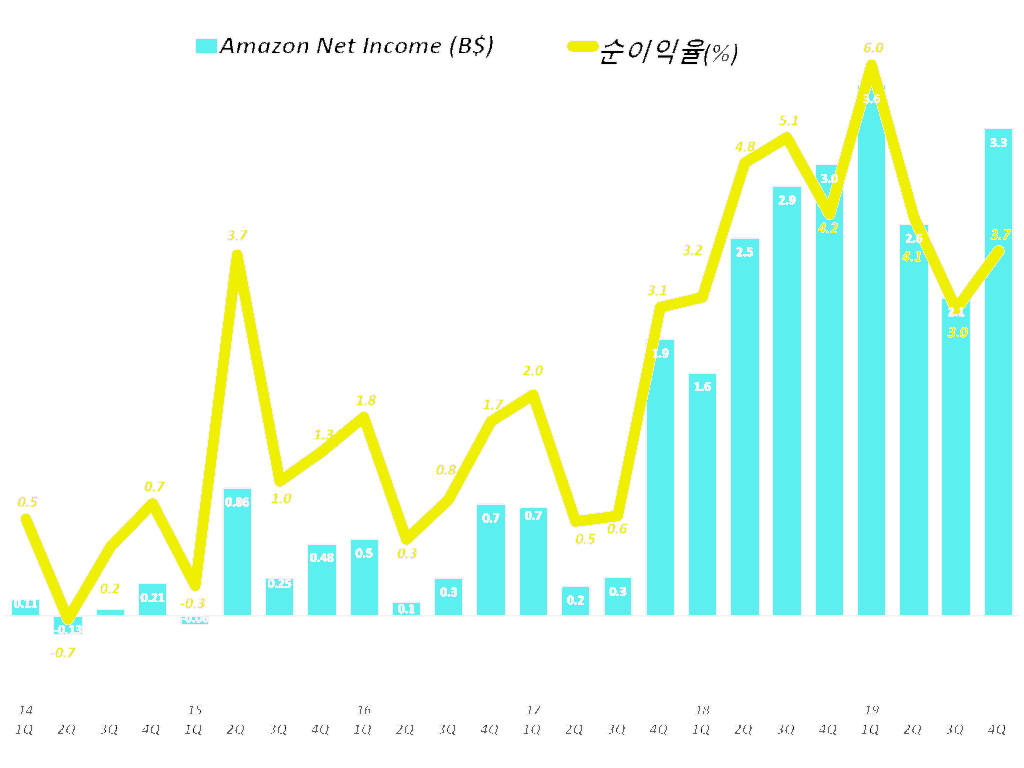 아마존 분기별 순이익 및 순이익율 추이(2014년 1분기 ~ 2019년 4분기) Amazo Net Imcome & Net Income Margin by quarter, Graph by Happist