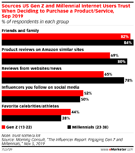 아래 emarketer가 정리한 밀레니얼과 Z세대가 인플러언서에 더 의지한다는 글을 소개합니다.