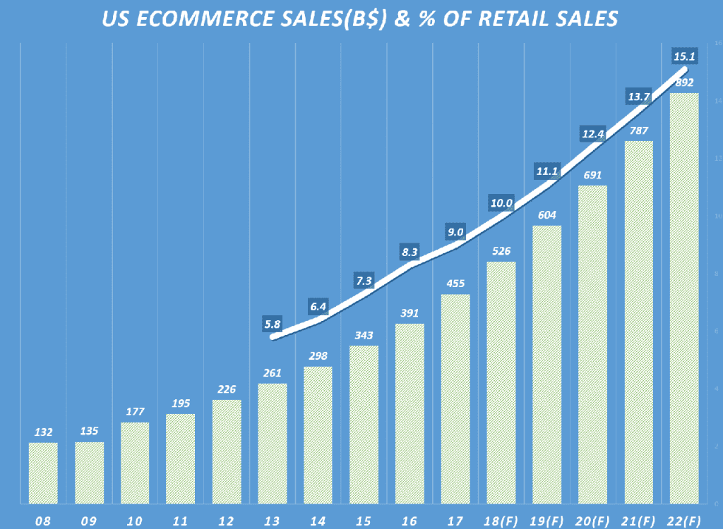 아직 미국은 이커머스 비중이 상대적으로 낮습니다. 조사 자료마다 다르지만 이마케터는 이커머스 비중을 10%정도로 봤습니다.