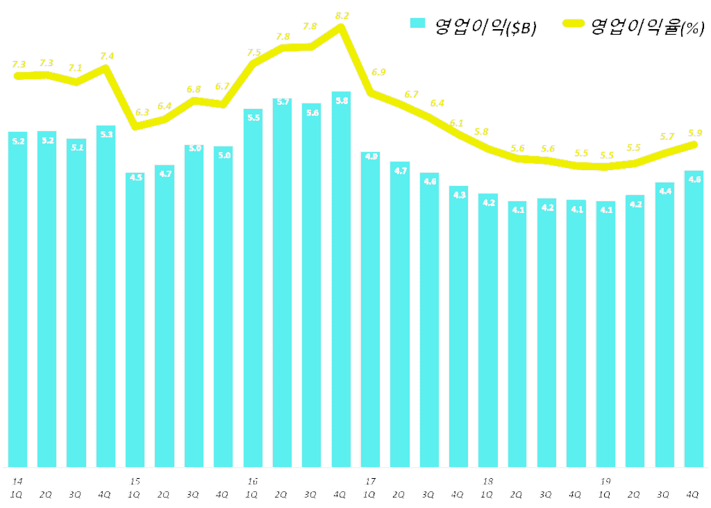 아직 예전 수준에는 미치지 못하지만 영업이익율은 5.9%까지 올라가면서 점점 더 개선되는 모습을 보여주고 있습니다.