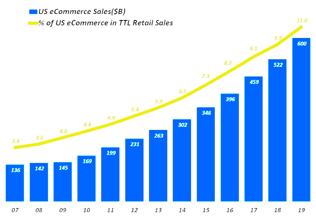 2019년 미국 이커머스 매출은 5,995억 달러로 전체 소매업 매출 내 비중이 처음으로 10%을 돌파한 11%를 차지해 2018년 9.9%에 비해서 1.1%p 늘어났습니다.