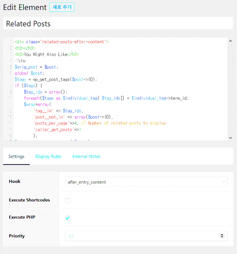 세팅에서 Hooks은 after_entry_content를 선택했습니다. 여기 말고 다른 곳에 추가하고 싶다면 워드프레스 Hooks 명단에 적절한 장소에 해당하는 hook이름을 적용합니다.