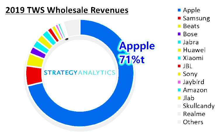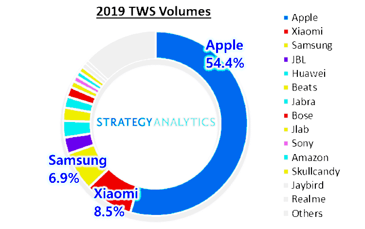 시장조사업체 스트래티지 애널리틱스(Strategy Analytics, SA)가 추정한 2019년 무선이어폰 시장점유율 데이타입니다.