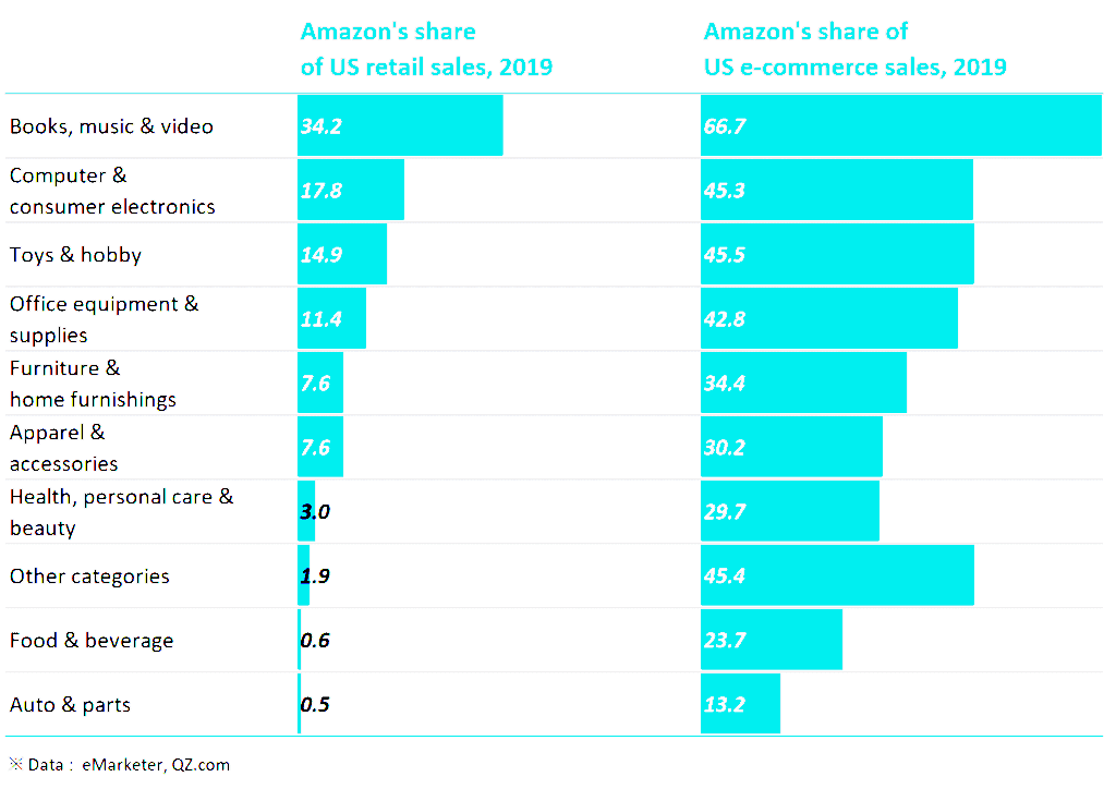 도서나 전자제품 등 일찍부터 이커머스 비중이 높은 품목에서는 아마존 점유율이 매우 높지만 이커머스 비중이 낮은 식료품 등에서는 아마존은 아직 그렇게 큰 힘을 쓰지 못하고 있죠.