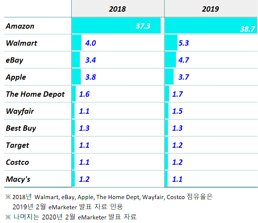 아래는 2018년과 2019년 미국 이커머스 시장점유율인데요. 우리가 상식적으로 아는 것처럼 아마존이 38.7%로 절대적인 우위를 점하고 있습니다. 그다음으로 월마트가 2위이지만 점유율은 5.3%에 불과하죠.