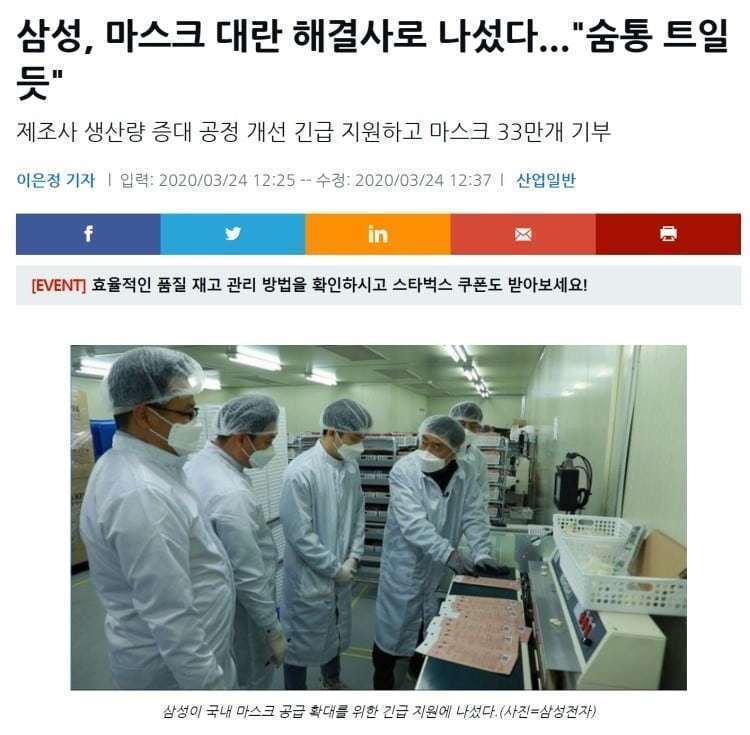 이런 가운데 마스크와 전혀 상관이 없어 보이는 업체지만 삼성이 가진 역량을 도원해 마스크 관련 솔류션을 제안해 실질적으로 마스크 공급을 늘릴 수 있는 여러가지 활동과 이들의 활동을 적절히 홍보하면서 삼성 이미지를 개선하고 있는데요.