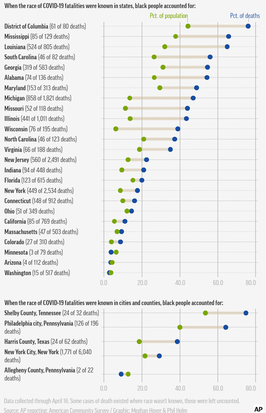 AP통신이 분석한 바에 따르면 조사 지역에서 코로나19로 사망한 사람들의 33%가 아프리카계 미국인이지만, 이들 인구 비중은 겨우 14%에 불과했습니다.