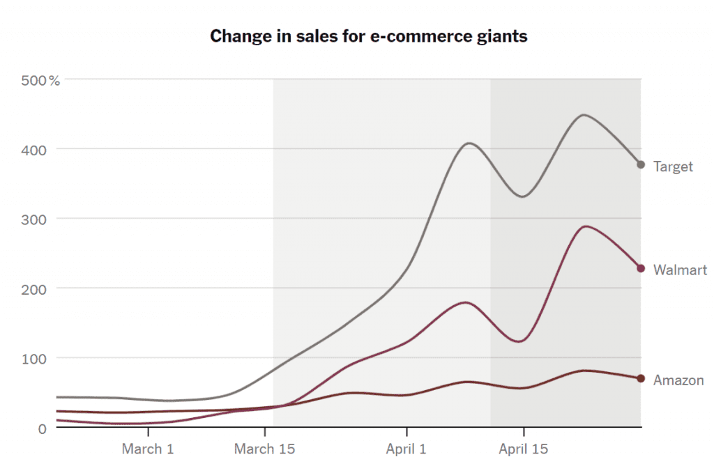 아마존도 크게 성장했지만 4월 한달동안 타겟은 390%, 월마트는 230% 성장하면서 80% 성장에 그친 아마존을 크게 따돌렸습니다.