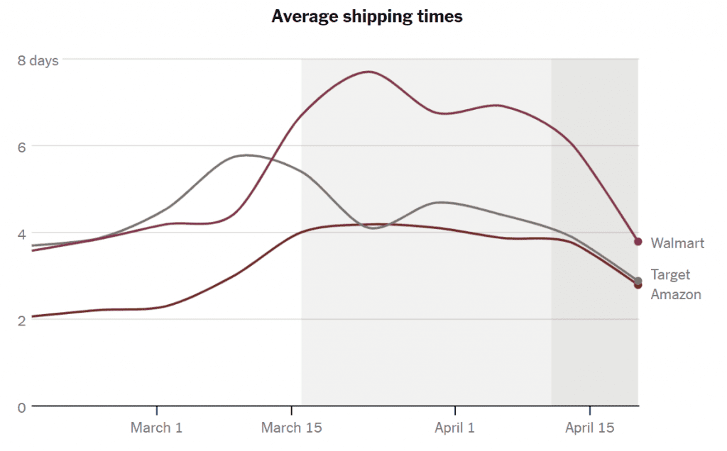또한 타겟은 빠른 배송을 전문으로 하는 기업 인수로 배송시간에서 아마존과 비슷해지면서 각광을 받음 - 음식 배달은 도어대시(DoorDash)가 압도적인 성과를 냈는데, 경쟁자들이 뉴욕과 같은 도심에 집중해 코로나19 피해를 심하게 받은 지역이라 인원 보충등이 어려웠지만 도어대시(DoorDash)는 교외중심이라 피해를 크게 받지 않음