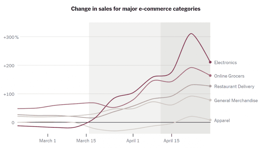 미국의 신용카드와 직불카드 거래를 추적하는 어니스트 리서치(Earnest Research)에 따르면 팬메믹 기간동안 전자제품과 온라인 식료품 판매가 가장 크게 증가했다고 합니다.