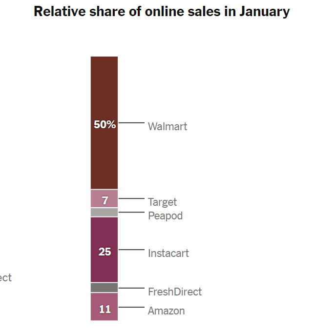 코로나 팬데믹 이전에 온라인 식료품 판매는 월마트 점유율이 50%이상으로 가장 높았고 이어 인스타카트가 25%를 차지했다고 합니다. 아마존은 11%에 불과해 이 시장에서 존재는 상대적으로 미약했습니다.