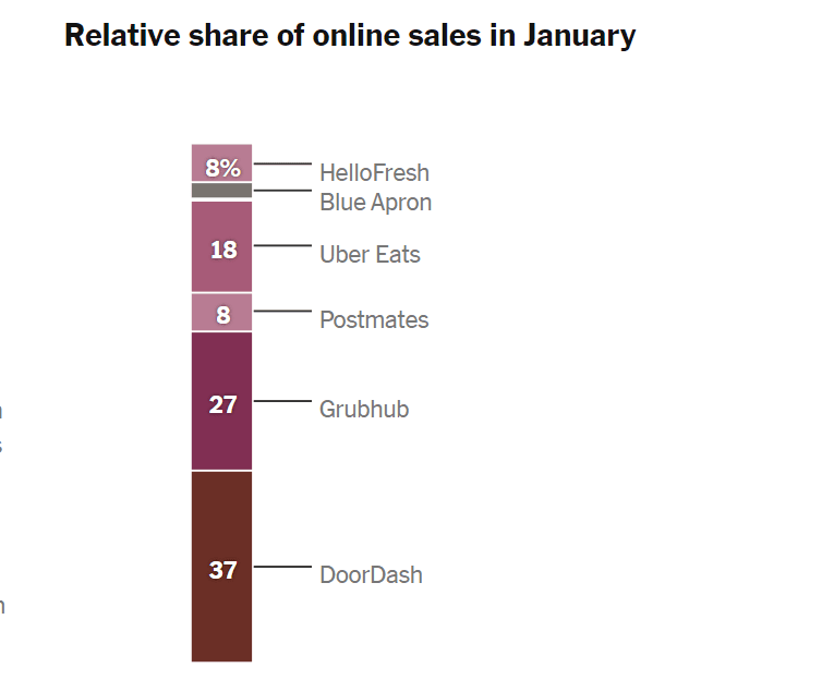 코로나 팬데이이 시작되기 전 20년 1월 온라인 음식 배달은 도어대시(DoorDash) 37% > 그럽허브(Grubhub) 27% > 우버이츠(Uber Eats) 18% 순이었습니다.