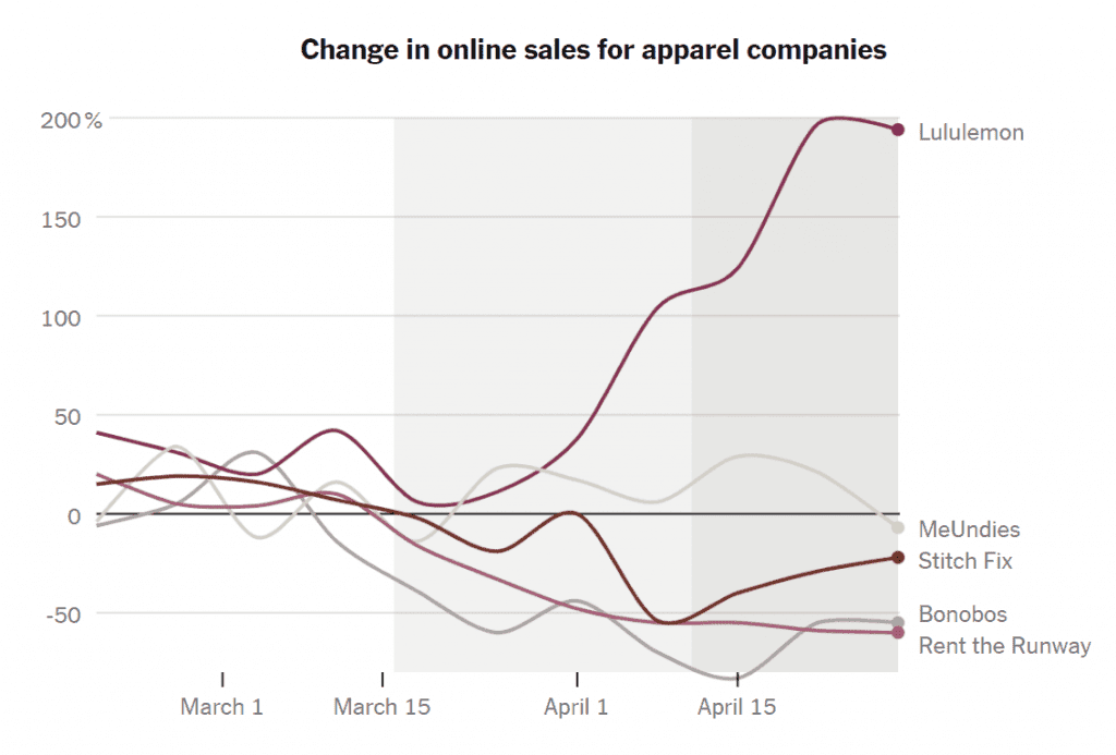 그러나 코로나 팬데믹으로 수요가 급속히 변하면서 집에서 입을 수 있는 의류 라인업이 풍부한 룰루레몬(Lululemon)이 가장 빠르게 성장했습니다.