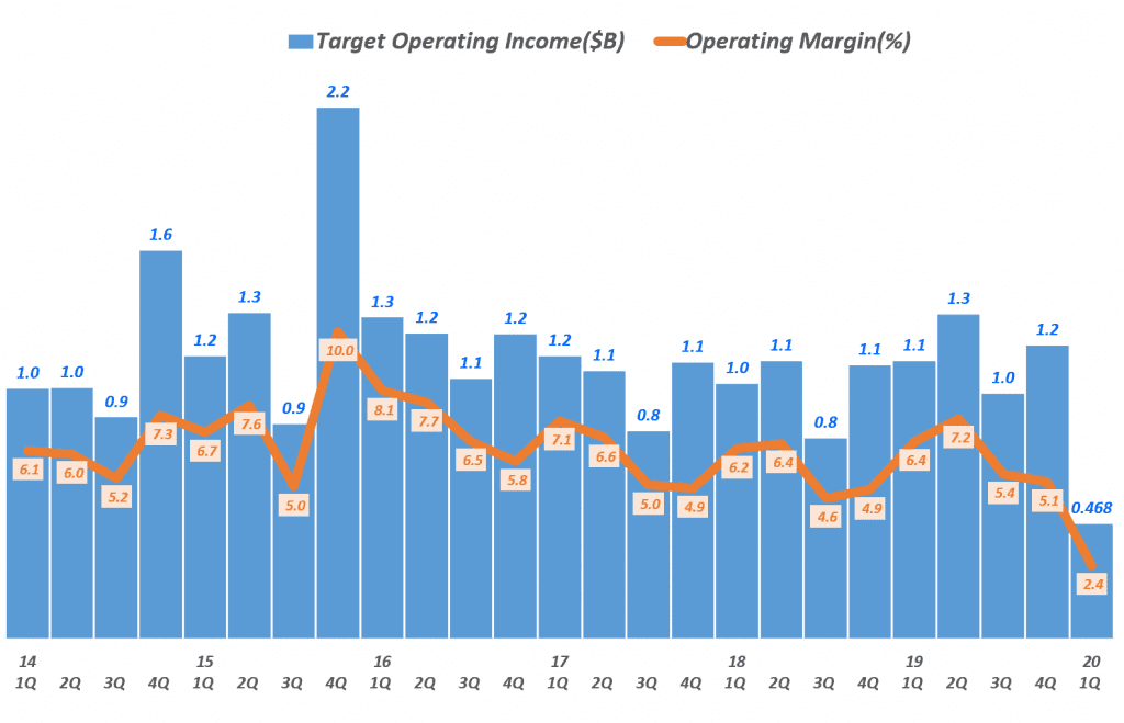 타겟의 영업이익율은 5% 전후에서 유지되어 왔으나 이번 20년 1분기에는 코로나 팬데믹 대응 비용이 증가하면서 영업이익율은 2.4%로 크게 하락했습니다.