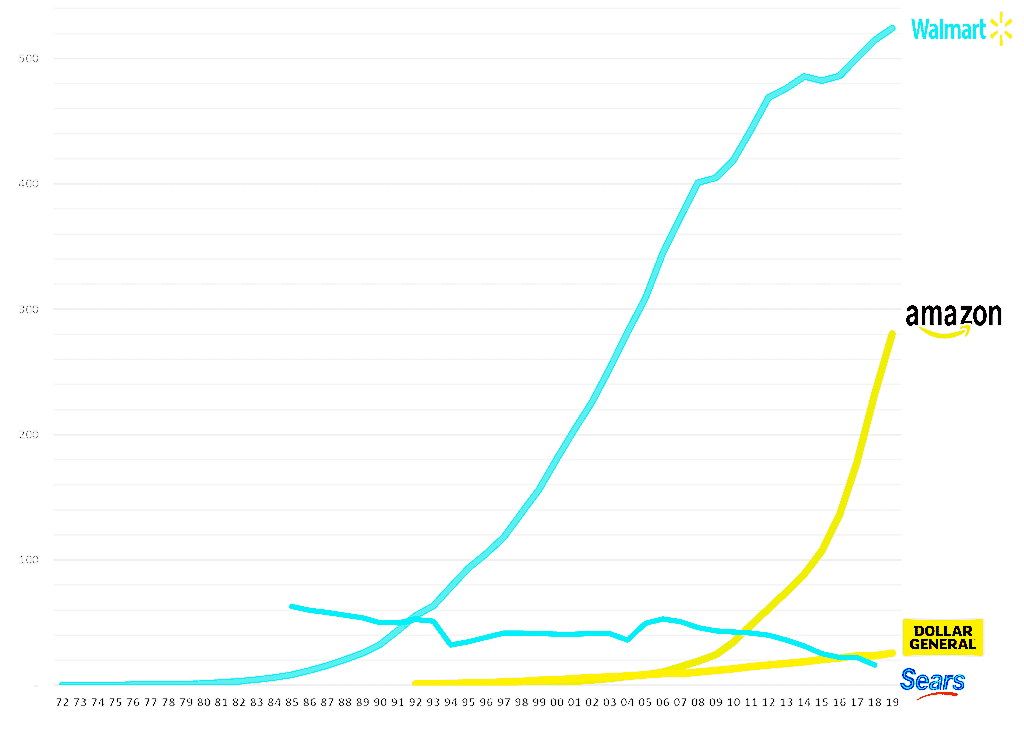월마트 vs 아마존 vs 달러제럴 vs 시어즈 미국 주요 유통의 장기 매출 추이, Graph by Happist