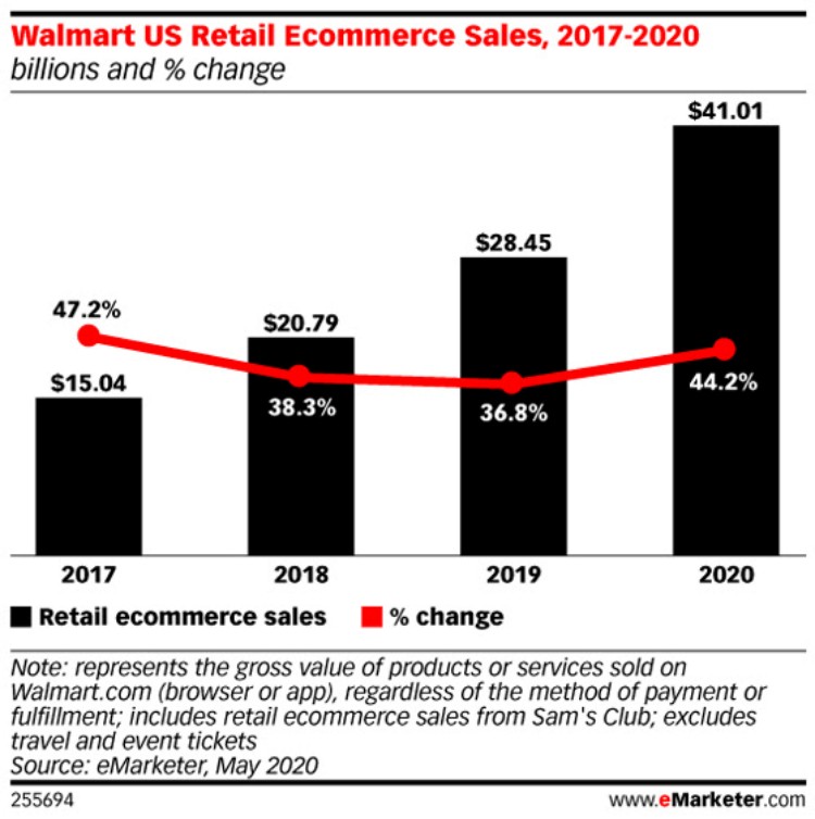 이마케터는 월마트 이커머스 매출이 급증하면서 2020년 이커머스 매출이 410억 달러에 이르러 전년 비 44.2% 증가할 것으로 전망했습니다.