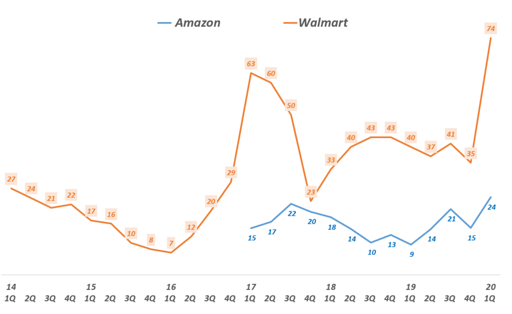 아마존은 1분기(20년 1월 ~ 3월)간 이머커스 성장율 20%에 그친 반면 월마트는 1분기(2월 ~ 4월) 이커머스 성장율이 74%에 달하면서 성장율에서 아마존을 능가했습니다. 미록 월마트가 4월을 반영한다고해도 크게 달라지지는 않습니다.