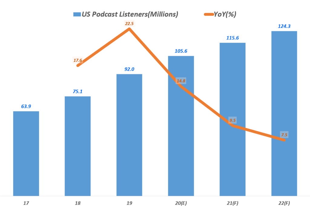 이마케터가 추산한 자료에 따르면 2019년 미국 팟캐스트 청취자는 9천 2백만명으로 전년 비 22.5% 증가했고, 2020년에는 1억 6백만명에 이르러 15%정도 성장할 것으로 예상하고 있습니다.