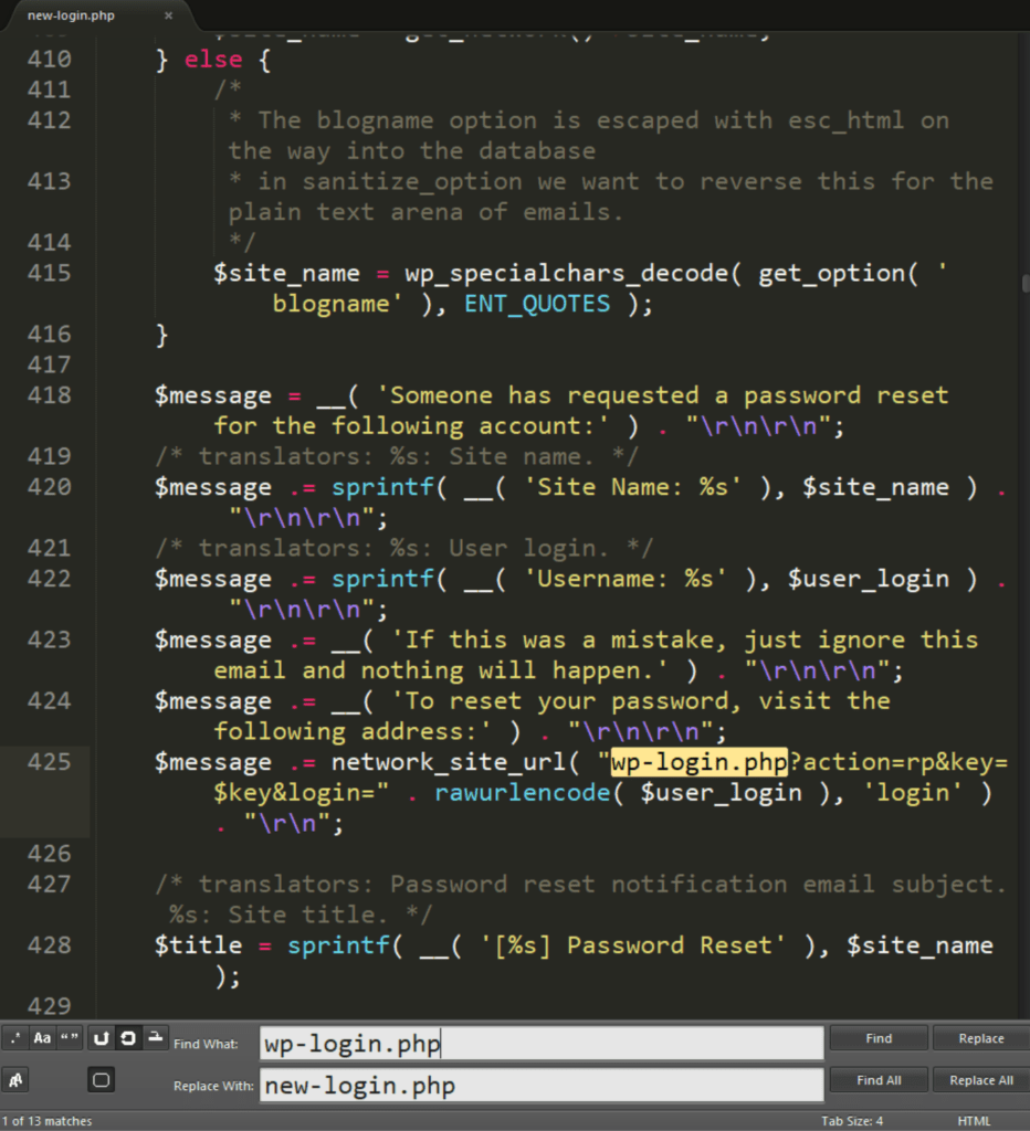 즉 wp-login.php이란 단어를 찾아서 new-login.php으로 대체해 주면 됩니다. 이는 편집기의 찾기 – 바꾸기 기능으로 간단히 처리할 수 있습니다.
