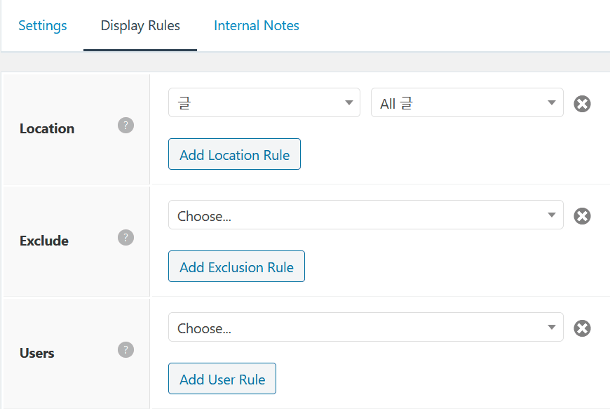 훅 엘리먼트(Hook Element) 디스플레이 룰에는 아래와 같이 모든 글에 적용하는 것으로 설정합니다.