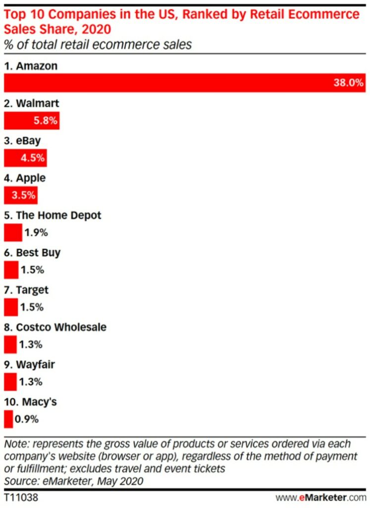 2020년 미국 업체별 이커머스 점유율 전망, Data & Graph by eMarketer