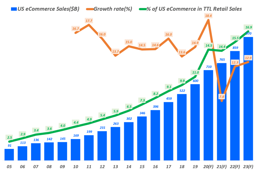 이마케터가 추정한 바에 따르면 2020년 미국 이커머스 판매 비중은 14.5%에 이를 것으로 예상하고 있습니다. 2019년 11%에 불과했지만 코로나 팬데믹으로 거의 15%선가지 증가한 것이죠.