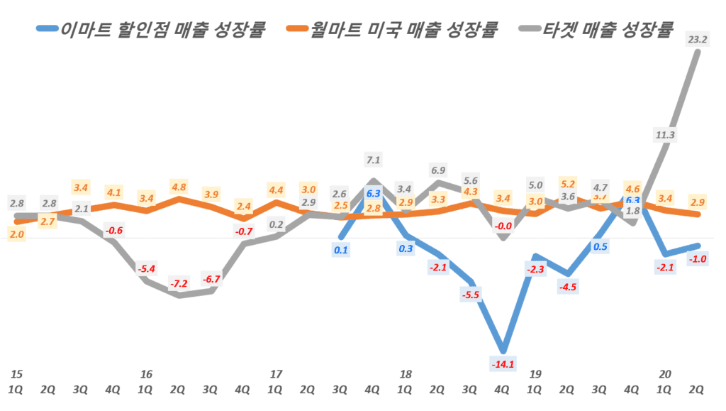 이마트 vs 월마트 미국  vs 타겟, 분기별 매출 성장률 추이( ~ 20년 2분기), Graph by Happist
