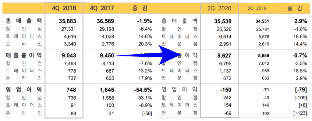 이마트 실적, 18년 4분기 실적 양식 vs 20년 2분기 실적 양식