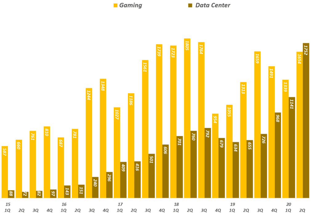 엔비디아 게이밍 부문 매출 성장률은 2019년 4분기부터 56.3%, 26.9%, 26%로 최근 3분기 동안 빠르게 성장 - 코로나 팬데믹으로 엔비디아 데이타센터 부문 크게 성장