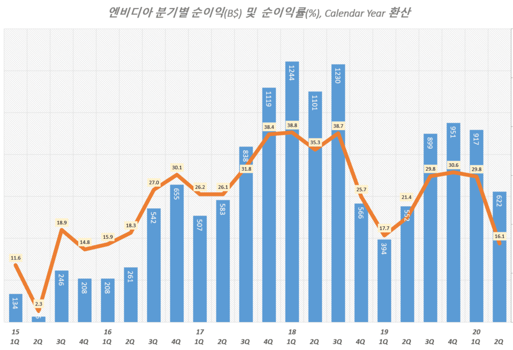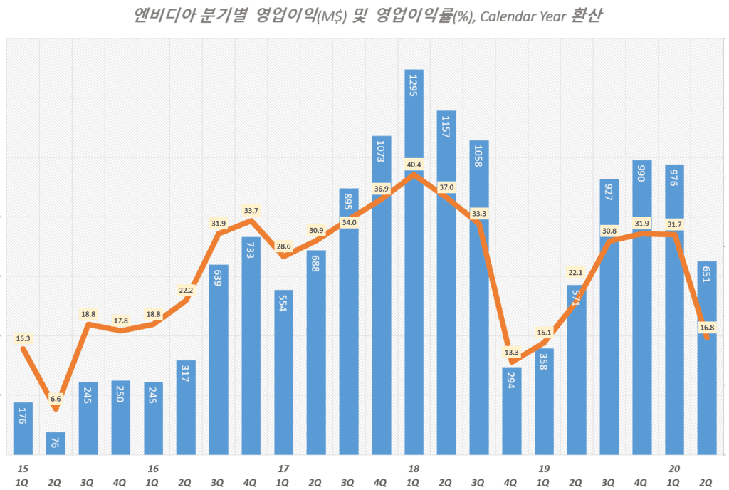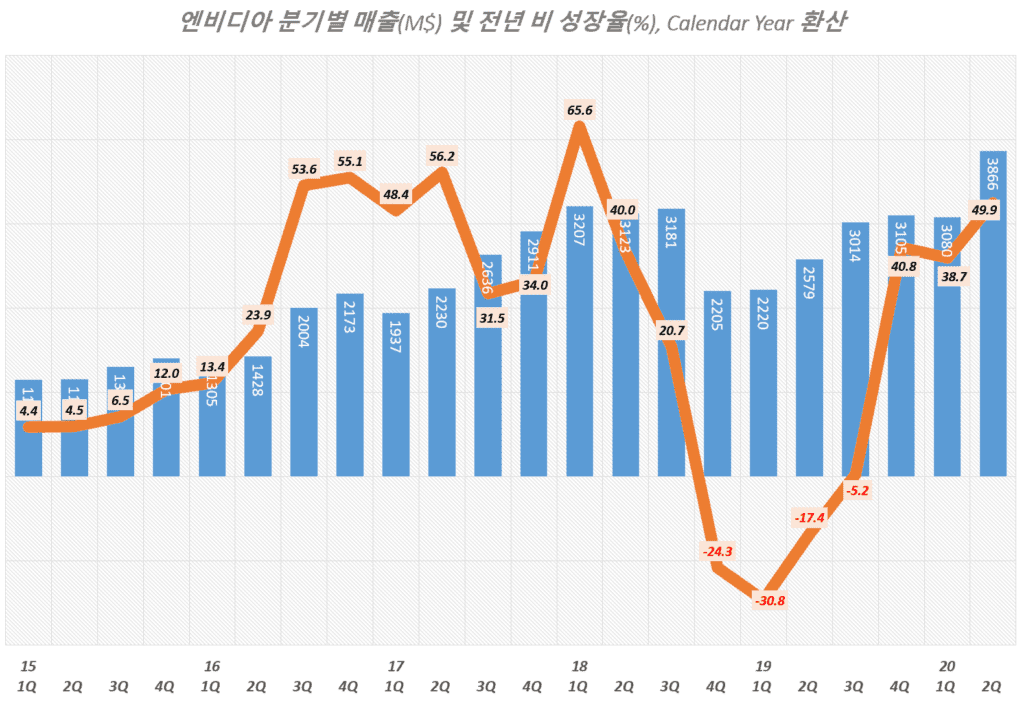 엔비디아는 회계년도 21년 2분기(20년 5월 ~7월) 매출 38.7억 달러, 영업이익 6.5억 달러를 올렸다고 발표했습니다.