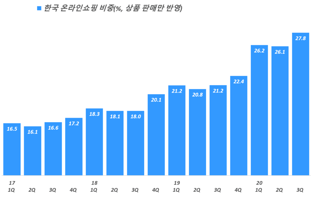 분기별 한국 이커머스 비중 추이, 20년 3분기 27.8%