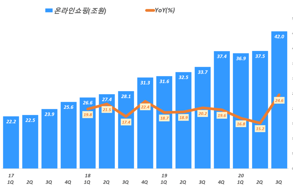 한국 통계청이 집계한 바에 따르면 최근 21년 1분기 온라인쇼핑 시장규모는 42조원으로 전년비 동기 비 21.1% 성장했습니다.