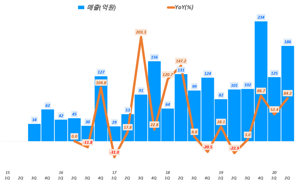 따라 최근 파크시스템스 매출도 급증하고 있습니다. 20년 2분기 파크시스템스 매출 186억으로 전년 비 무려 84.2% 증가해 최근 3분기동안 50~80% 성장률을 보여주고 있습니다.