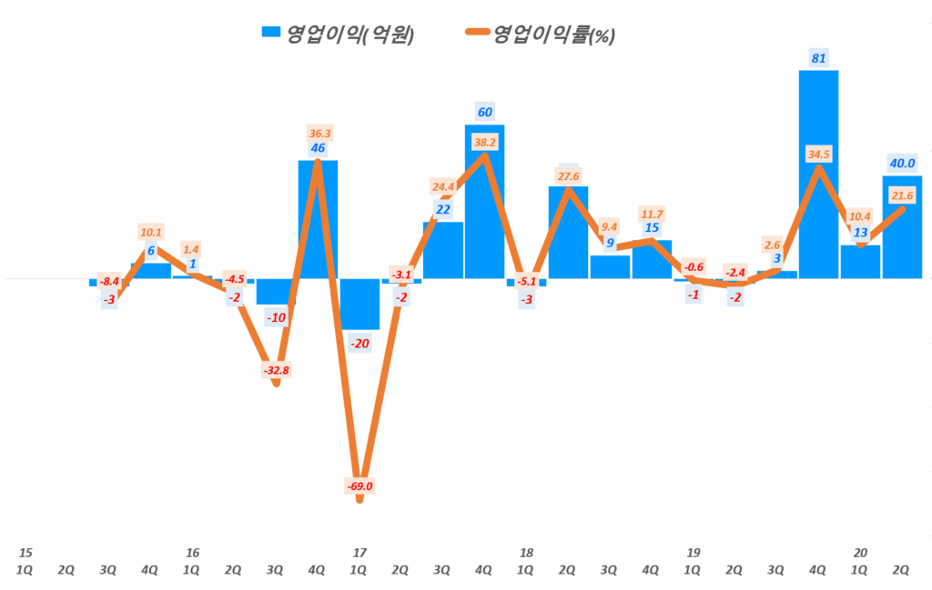 이는 전년 비 97.3% 증가한 수준 - 2분기 영업이익 40억, 영업이익율 21.6%