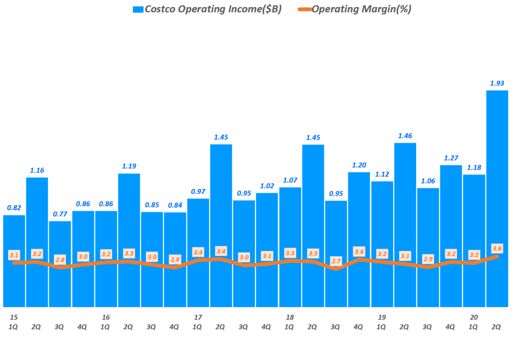 코스트코 실적, 분기별 코스트코 영업이익 및 영업이익률추이( ~ 20년 2분기), Costco quarterly Operating Income & Operating Income margin(%), Graph by Happist