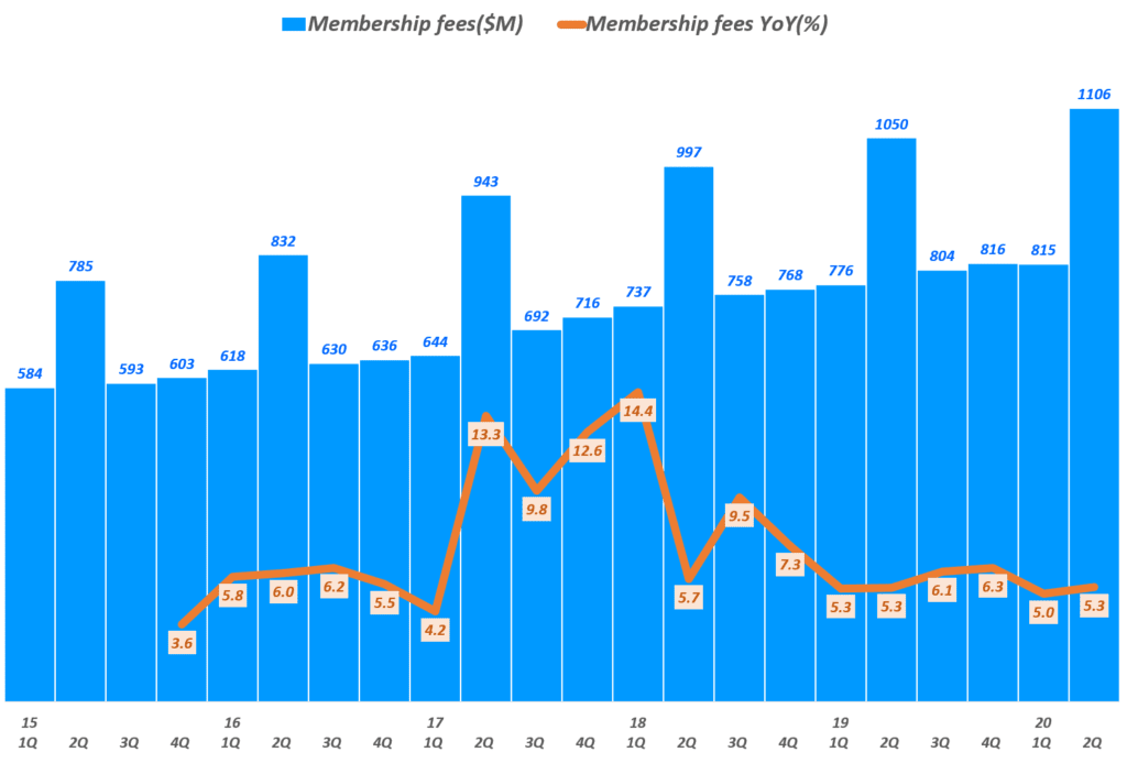 코스트코 실적, 분기별 코스트코 회원 수수료 매출 및 전년 비 성장률 추이( ~ 20년 2분기), Costco quarterly Membership Fees & YoY(%), Graph by Happist