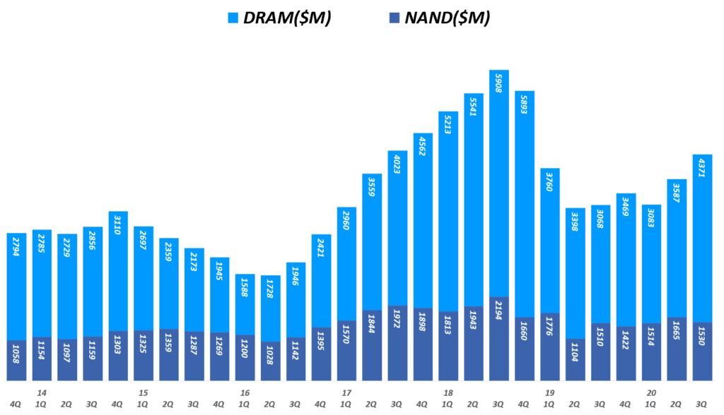 마이크론 실적, 분기별 마이크론 디램 매출 및 NAND 매출 추이( ~ 20년 3분기), 회계년도를 유사한 분기로 환산 적용, Micron Technology Revenueof DRAM & NAND($M), Graph by Happist