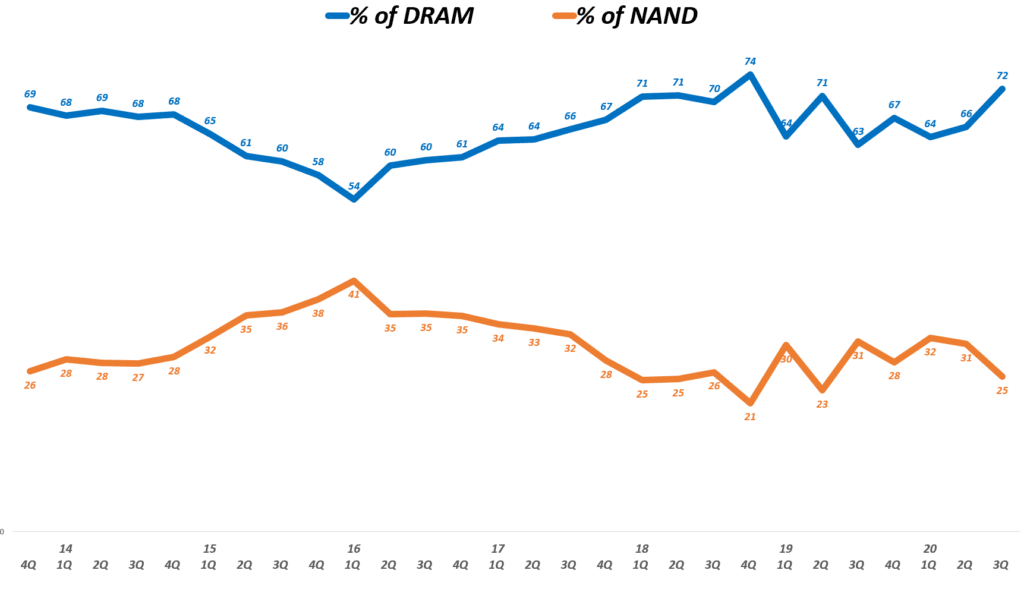 마이크론 실적, 분기별 마이크론 매출 내 디램 비중 및 NAND 비중 추이( ~ 20년 3분기), 회계년도를 유사한 분기로 환산 적용, Micron Technology % of DRAM & NAND(%), Graph by Happist