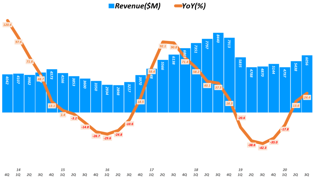 마이크론 실적, 분기별 마이크론 매출 및 전년 비 성장률 추이( ~ 20년 3분기), 회계년도를 유사한 분기로 환산 적용, Micron Technology Revenue & YoY growth rate(%), Graph by Happist