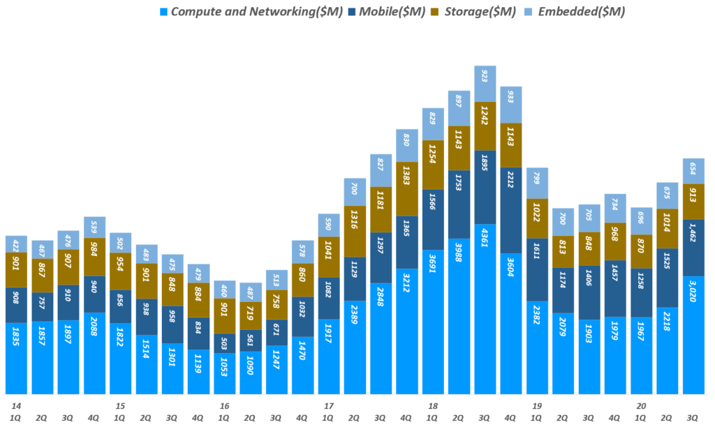 마이크론 실적, 분기별 마이크론 사업부별 매출 추이( ~ 20년 3분기), 회계년도를 유사한 분기로 환산 적용, Micron Technology Revenue per Business Unit, Graph by Happist