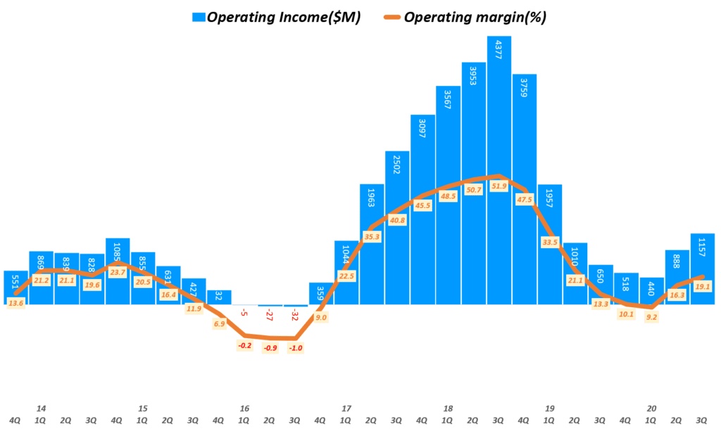 마이크론 실적, 분기별 마이크론 영업이익 및 영업이익률 추이( ~ 20년 3분기), 회계년도를 유사한 분기로 환산 적용, Micron Technology Operating Income & Operating margin(%), Graph by Happist