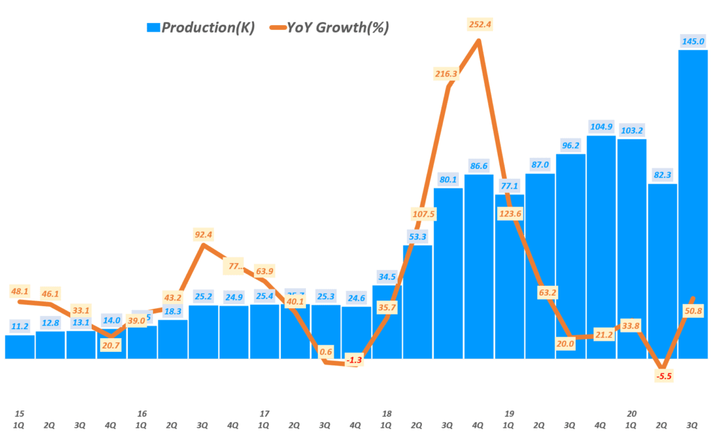 이번 20년 3분기 테슬라는 14.5만대를 생산, 분기 기준 기네스를 기록했습니다.