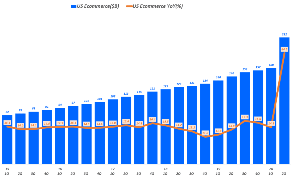 20년 2분기 미국의 주요 유통들의 이커머스 성장률 추이를 비교한 그래프입니다. 이번 코로나 팬데믹을 맞아 유통마다 엄청난 이커머스 성장률을 보였습니다.
