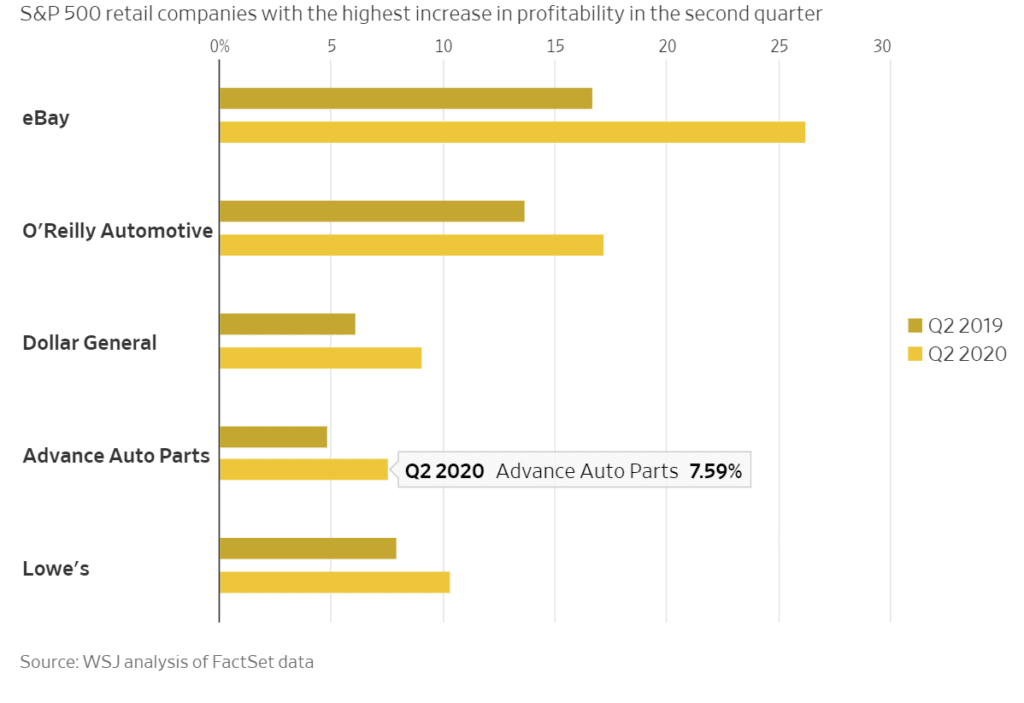 20년 2분기 S&P 500에 속하는 유통업체들의 이익 변화, Image from WSJ