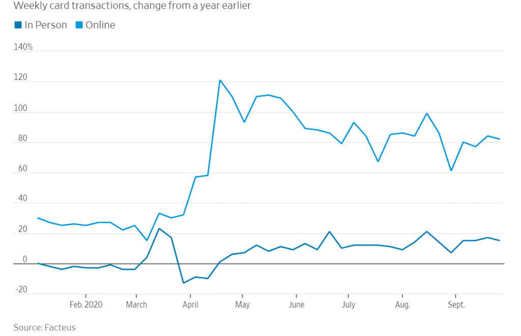 금융데이터 업체 팩테우스(Facteus)가 집계한 주간 거래량에 따르면 4월 초부터 신용카드와 직불카드를 이용한 온라인 거래는 매달 평균 88%씩 증가했습니다.